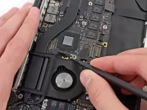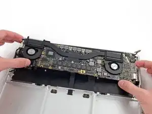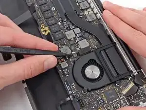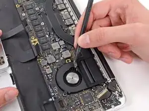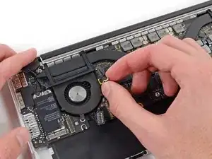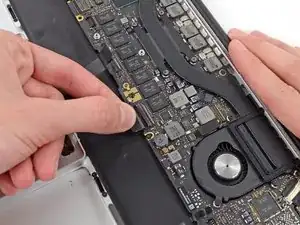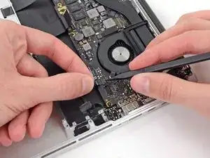 Отведите в сторону ленту левого вентилятора, чтобы открыть скрытый винт, крепящий узел логической платы к верхней крышке.