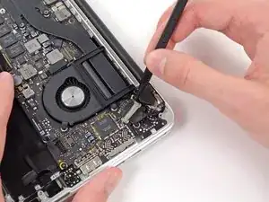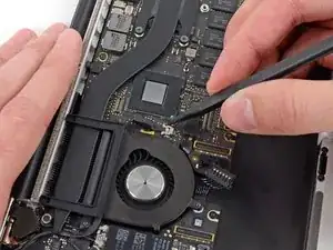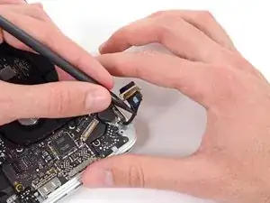 Используйте плоский конец лопатки, чтобы приподнять разъем кабеля SSD из его гнезда на логической плате.