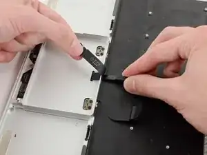 Используйте кончик лопатки, чтобы перевернуть фиксирующую планку на ZIF‑разъёме ленты клавиатуры вверх.