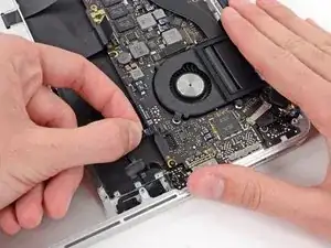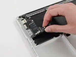 Удаление этой платы обеспечит отключение аккумулятора на протяжении всего ремонта, предотвращая случайное включение компьютера. Также рекомендуется вынуть её, чтобы она случайно не выпала.