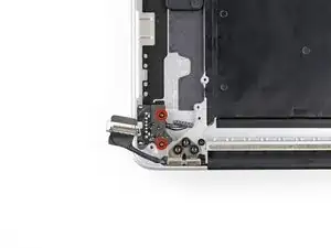 Удалите два винта T5 Torx длиной 4,0 мм, фиксирующие плату питания MagSafe к верхнему корпусу.