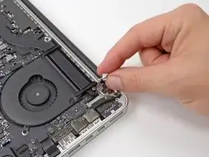 Используйте наконечник лопатки, чтобы отогнуть фиксатор кабеля дисплея и поверните его в сторону разъёма питания DC-In.