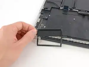 Снимите две алюминиевые крепежные скобы петель с MacBook Pro.
