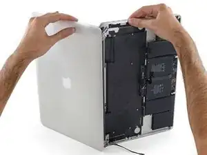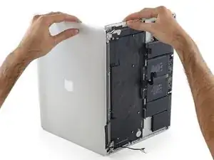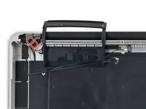 Снимите две алюминиевые накладки петель с MacBook Pro.