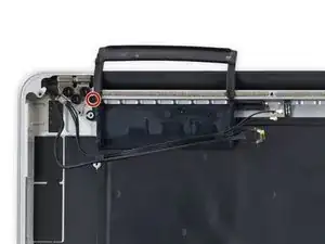 Снимите четыре из шести винтов T8 Torx длиной 5,3 мм, фиксирующих дисплей к верхней части корпуса.