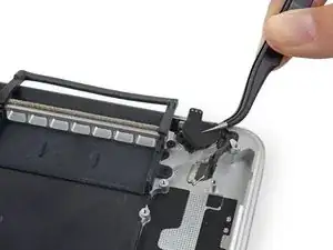 Используйте кончик лопатки, чтобы приподнять фиксатор кабеля матрицы и повернуть его в сторону разъёма питания MagSafe 2 на корпусе компьютера.
