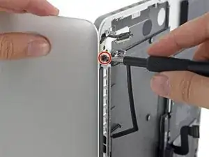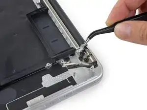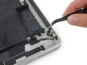 Снимите два винта T5 Torx длиной 3,2 мм, фиксирующие алюминиевые накладки петель к верхней части корпуса.