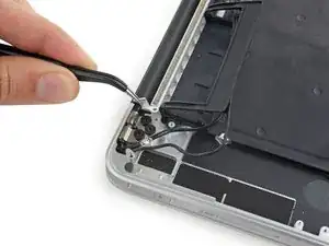 Используйте лопатку или пинцет, чтобы поднять три антенные кабеля AirPort вертикально из их гнезд на плате AirPort и отогните их в сторону, чтобы они не мешали.