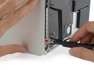 Держа дисплей и верхнюю часть корпуса вместе левой рукой, выньте оставшийся винт T8 Torx из нижнего (ближайшего к столу) кронштейна дисплея.