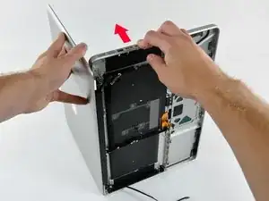 Возьмите верхнюю часть корпуса правой рукой и слегка поверните её к верхней части дисплея, чтобы верхний кронштейн дисплея освободился от края верхней части корпуса.