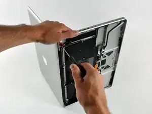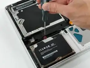 Снимите один винт Phillips, крепящий кронштейн жёсткого диска к верхней части корпуса.