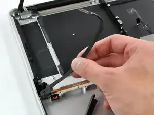 Используя наконечник лопатки, поднимите фиксирующий язычок ленточного кабеля подсветки клавиатуры.