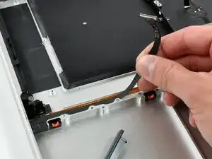 Поднимите кронштейн кабеля LVDS из верхней части корпуса.