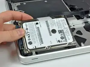 Поднимите жёсткий диск за свободную кромку и вытяните его из корпуса, следя за кабелем, который подключён к компьютеру.