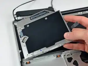 Поднимите оптический привод за правую кромку и вытяните его из компьютера.