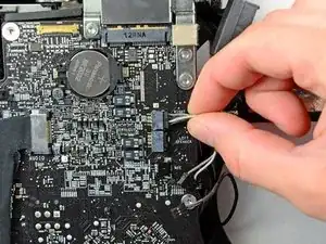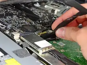 Используйте плоский конец лопатки, чтобы поддеть все три разъёма антенн AirPort и поднять их из гнёзд на плате AirPort.