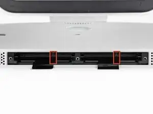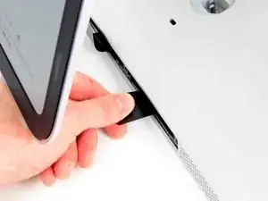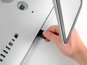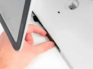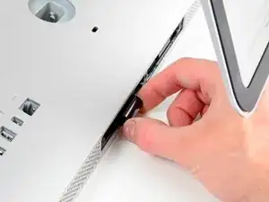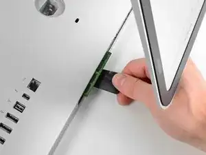 Оттяните черную пластиковую тягу от нижней кромки iMac, чтобы извлечь модуль(и) с этой стороны отсека для оперативной памяти.