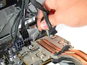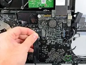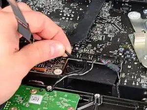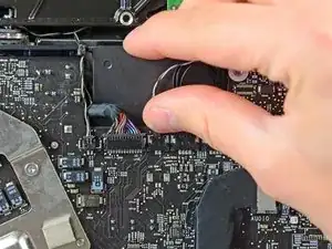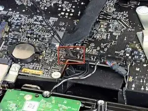 Потяните разъём вентилятора жёсткого диска в направлении верхнего края iMac, чтобы отключить его от гнезда на логической плате.