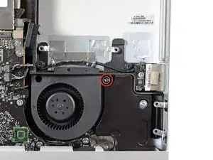 Снимите один винт T10 Torx длиной 13 мм, фиксирующий вентилятор оптического привода к внешнему корпусу.