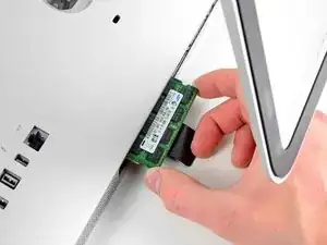 В вашем iMac четыре слота для оперативной памяти. Убедитесь, что вы вставляете каждый модуль горизонтально. Это предотвратит застревание модулей между соседними слотами.