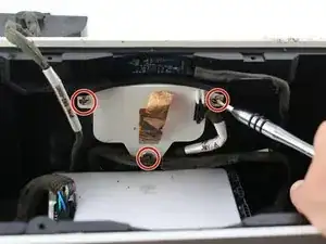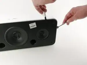 Отверните четыре винта JIS #1 длиной 3,3 мм, удерживающих большой динамик: вставьте отвёртку в шляпку винта и поворачивайте против часовой стрелки.