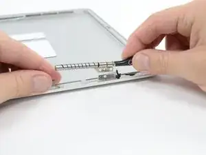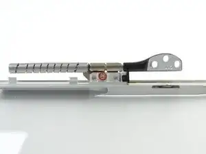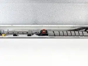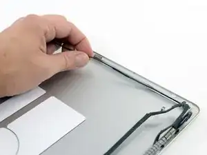Используйте кончик лопатки, чтобы поднять тонкую стальную фиксирующую скобу, удерживающую кабель данных дисплея в разъёме на ЖК-панели.