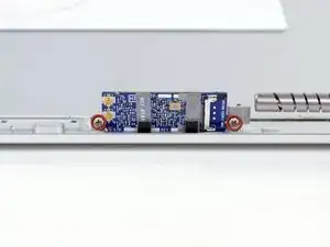 Выкрутите два винта Phillips #00 длиной 3,1 мм, крепящих плату AirPort к задней рамке дисплея.