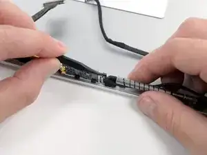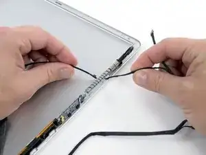 Осторожно протяните кабель ЖК-дисплея через прорезь в задней рамке дисплея.