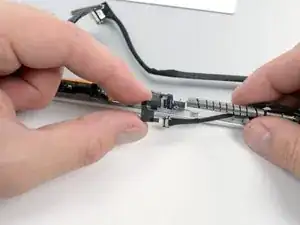 Осторожно протяните кабель дисплея через его прорезь в алюминиевом корпусе, при необходимости поворачивая его, чтобы он прошёл через отверстие.