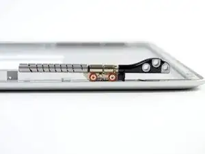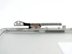 При сборке установите дисплей на место и закрепите винтами Torx кронштейн дисплея, затем закройте крышку и положите ноутбук экраном вниз, чтобы проверить совмещение экрана с корпусом. При необходимости ослабьте винты, отрегулируйте положение дисплея и снова затяните винты.