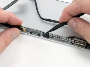 Сдвиньте кронштейн платы AirPort к нижней части корпуса дисплея с помощью кончика лопатки, чтобы он не мешал кабелю платы AirPort.
