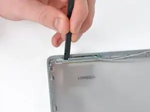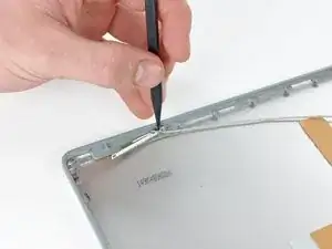 Антенна приклеена к задней рамке дисплея. Чтобы отсоединить её, поместите плоский конец лопатки за верхний край антенны и осторожно проверните лопатку, чтобы отсоединить антенну.