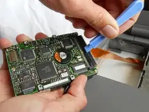 Вы можете использовать лопатку (инструмент на фото), чтобы отключить шлейф от жесткого диска.