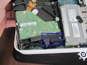 Поднимите жесткий диск из корпуса и отсоедините два SATA-кабеля от жесткого диска.