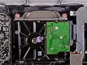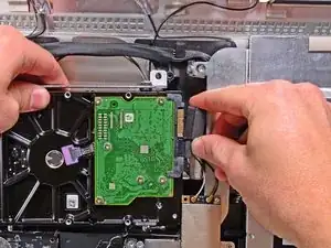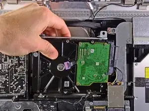 Небольшим поворотом выведите жесткий диск из внешнего корпуса и приподнимите его с монтажных штифтов в направлении верхнего края iMac.