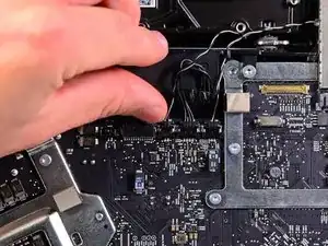 Потяните разъем датчика температуры жесткого диска в направлении верхнего края iMac, чтобы отсоединить его от гнезда на плате логики.