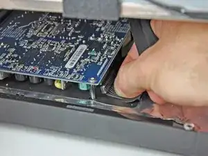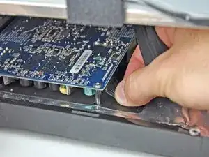 Отключите разъём шлейфа дисплея от гнезда на материнской плате, потянув прикреплённую к нему пластиковую язычок к себе, в сторону от iMac.