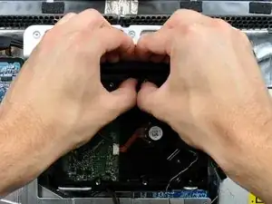 При установке жёсткого диска обратно будьте осторожны, чтобы не протолкнуть резиновые втулки через отверстия в корпусе нижними монтажными штифтами, так как их извлечение может потребовать демонтажа платы логики.