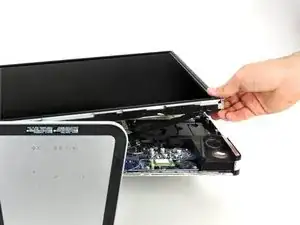 После того как верхний край передней рамки освободится от задней панели, поверните рамку в сторону подставки и снимите её с iMac.