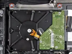 Снимите два винта Torx T8, фиксирующие верхнюю скобу к жесткому диску.