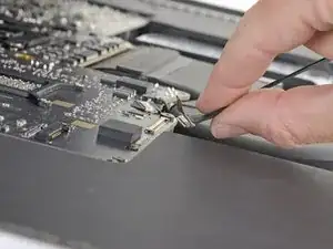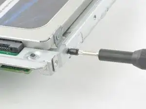 Используйте отвертку T8, чтобы снять два винта 7,3 мм, которыми левый кронштейн жесткого диска крепится к задней панели.