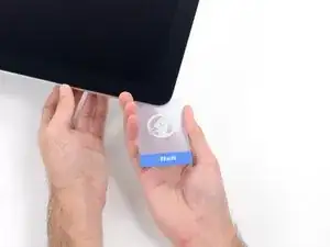 Начиная с верхнего правого угла iMac, вставьте пластиковую карту между дисплеем и рамой.