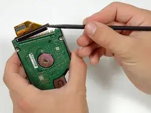 Отключите кабель жесткого диска от жесткого диска с помощью лопатки, осторожно ослабляя одну сторону за раз. (Будьте осторожны, не прижимайте слишком сильно, чтобы не погнуть выводы.) Возможно, вам придется удалить кусок оранжевой ленты, прикрепляющей шлейф к жесткому диску.