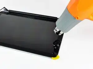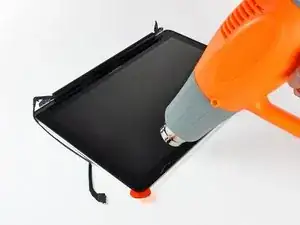 Используйте тепловую пушку, чтобы размягчить клей под чёрной полосой вдоль верхнего края стеклянной панели дисплея.