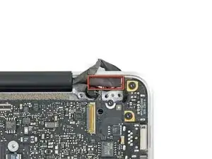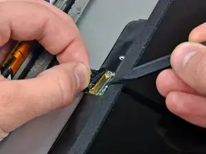Используйте наконечник лопатки, чтобы отогнуть тонкую стальную фиксирующую скобу, удерживающую кабель данных дисплея в его гнезде на ЖК-панели.