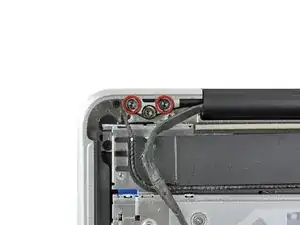 Снимите два винта, крепящих кронштейн кабеля дисплея к верхней части корпуса: