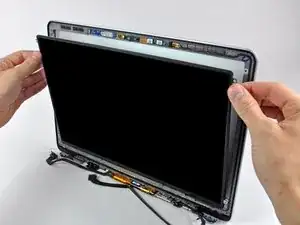 Потяните ЖК-панель к верхнему краю дисплея, чтобы вытащить электронику вдоль её нижнего края из выемки в алюминиевой рамке дисплея.