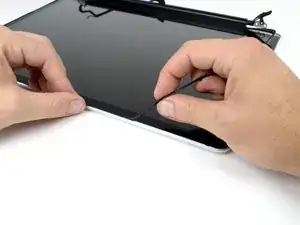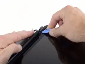 Вставьте пластиковый инструмент для открытия под чёрный резиновый уплотнитель в нижнем левом углу сборки экрана.