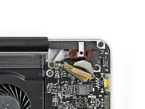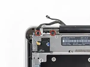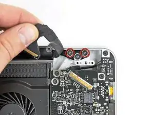 Удалите два винта Phillips 7,1 мм, фиксирующих держатель кабеля данных дисплея к верхней части корпуса.