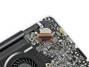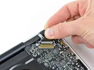 Поднимите чёрную пластиковую защёлку, прикреплённую к держателю кабеля данных дисплея, и поверните её в сторону стороны с разъёмом питания DC-In.